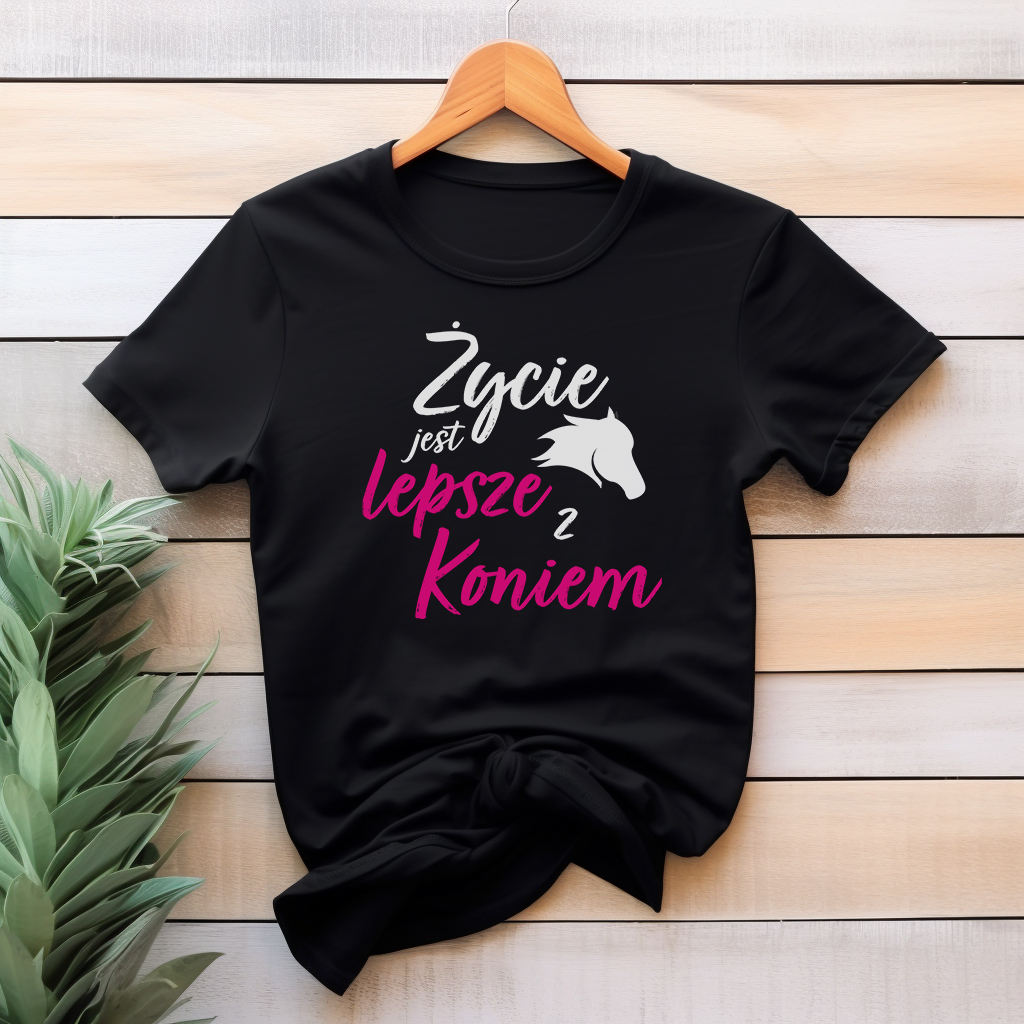 Koszulka damska bawełniana z nadrukiem ŻYCIE JEST LEPSZE Z KONIEM, bo przecież jest, prawda? :)