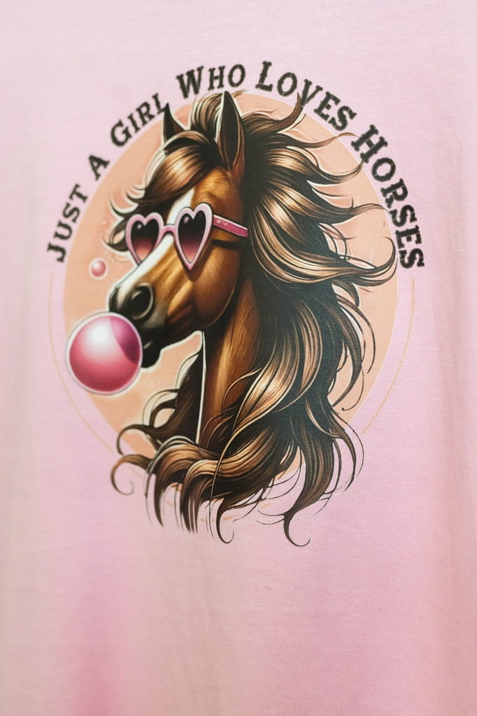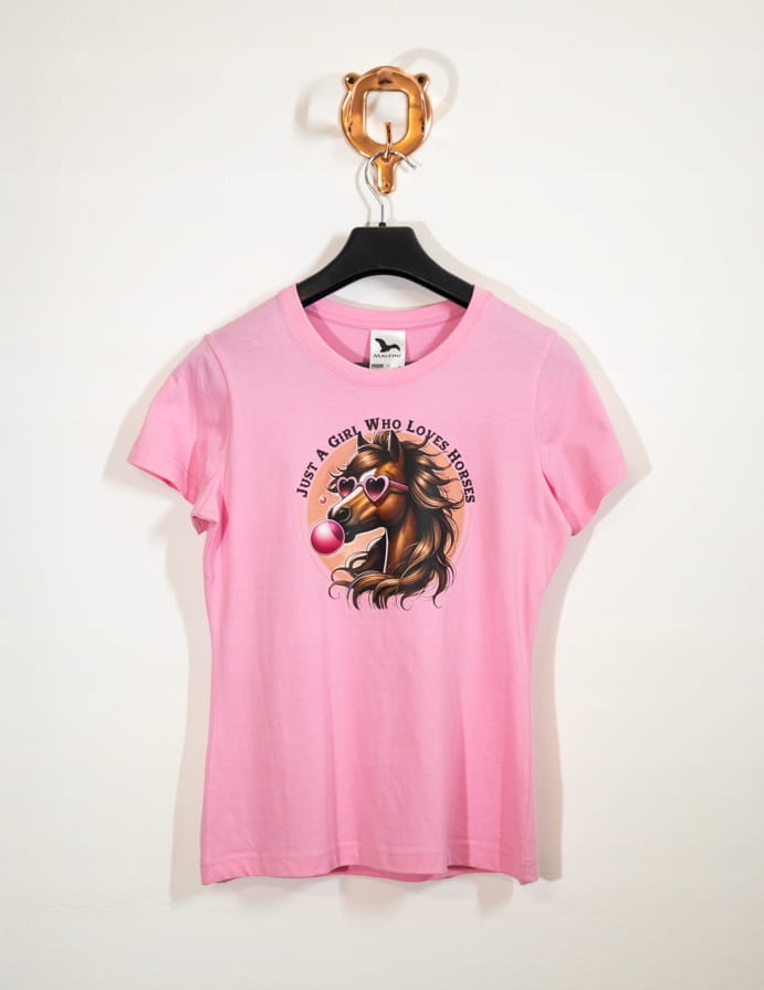 Stylowa koszulka damska w delikatnym, jasno różowym kolorze z kolorowym nadrukiem konia i napisem Girl who loves horses.