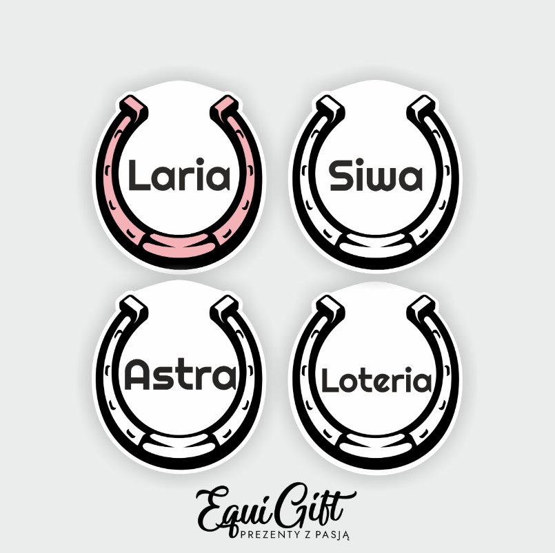 Naklejki są bardzo trwałe, wykonane z folii samoprzylepnej. Występują w dwóch wariantach, w podkowie mają 9cm wysokości, komplet zawiera 10 sztuk lub mniejsze w prostokącie o szerokości 8cm, komplet zawiera 15 sztuk