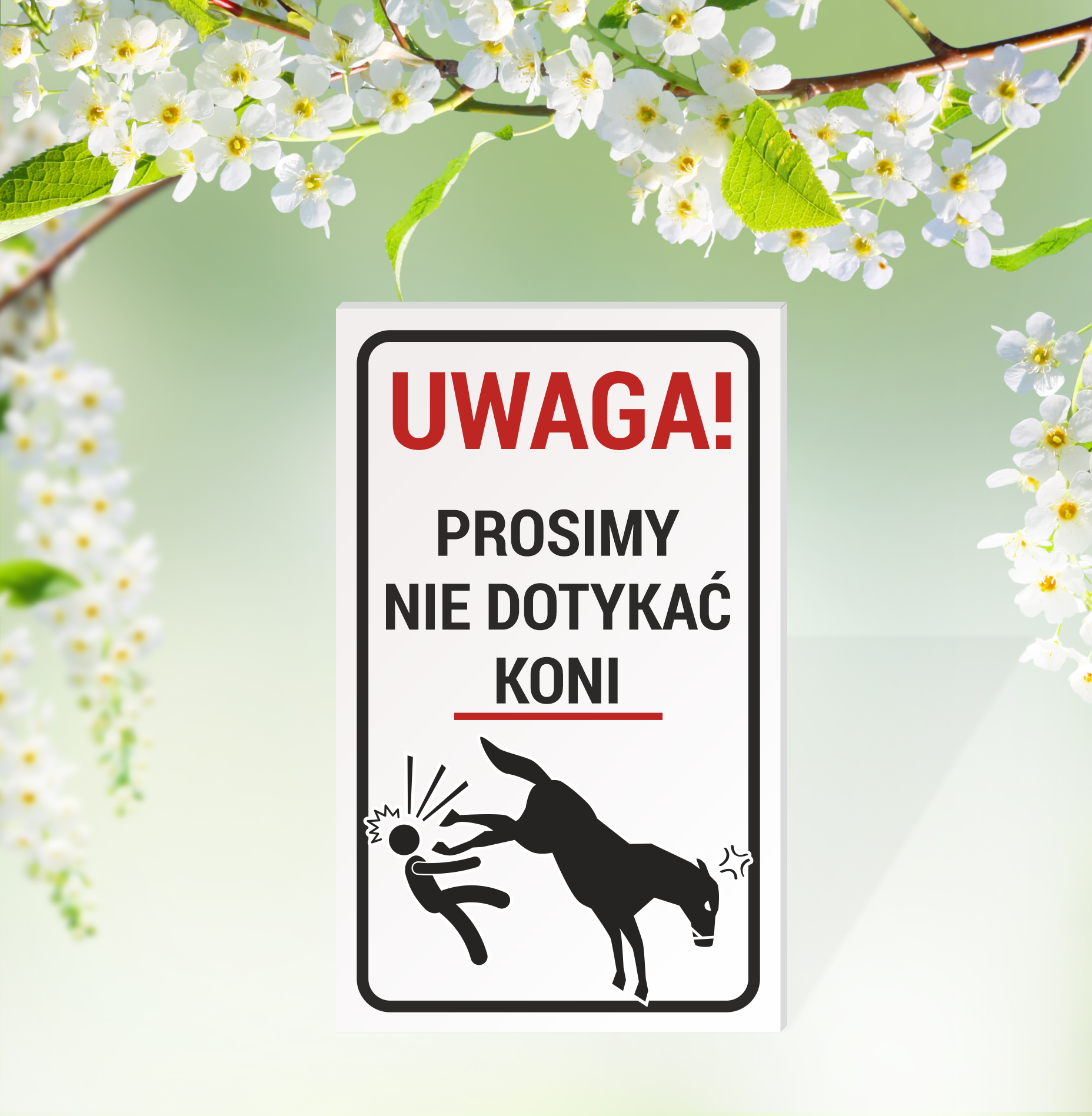 Tabliczka ostrzegawcza o wymiarach 35cm x 21cm z chwytliwą grafiką która powinna odstraszyć nieproszone osoby od naszego konia.